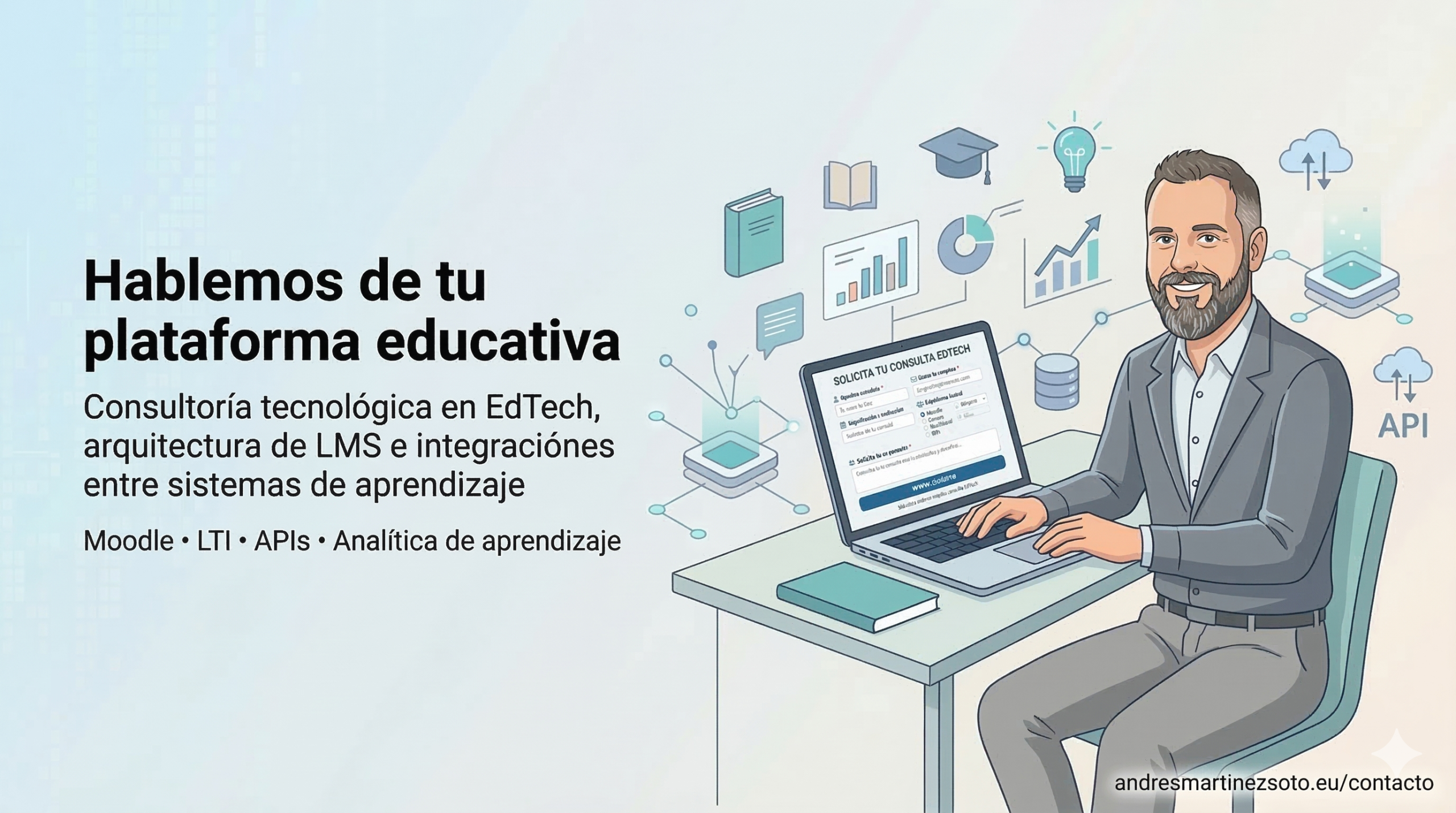 Soy Andrés Martínez Soto, arquitecto de software y consultor EdTech con más de 20 años de experiencia. Ayudo a universidades, empresas tecnológicas y organizaciones a diseñar, desarrollar e integrar ecosistemas de aprendizaje digital escalables y robustos.
